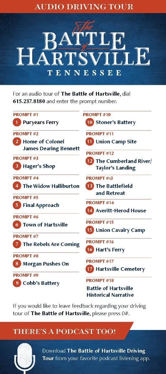 - Simply dial 615-237-8180 and enter the prompt number. Follow the audio tour prompts found below.