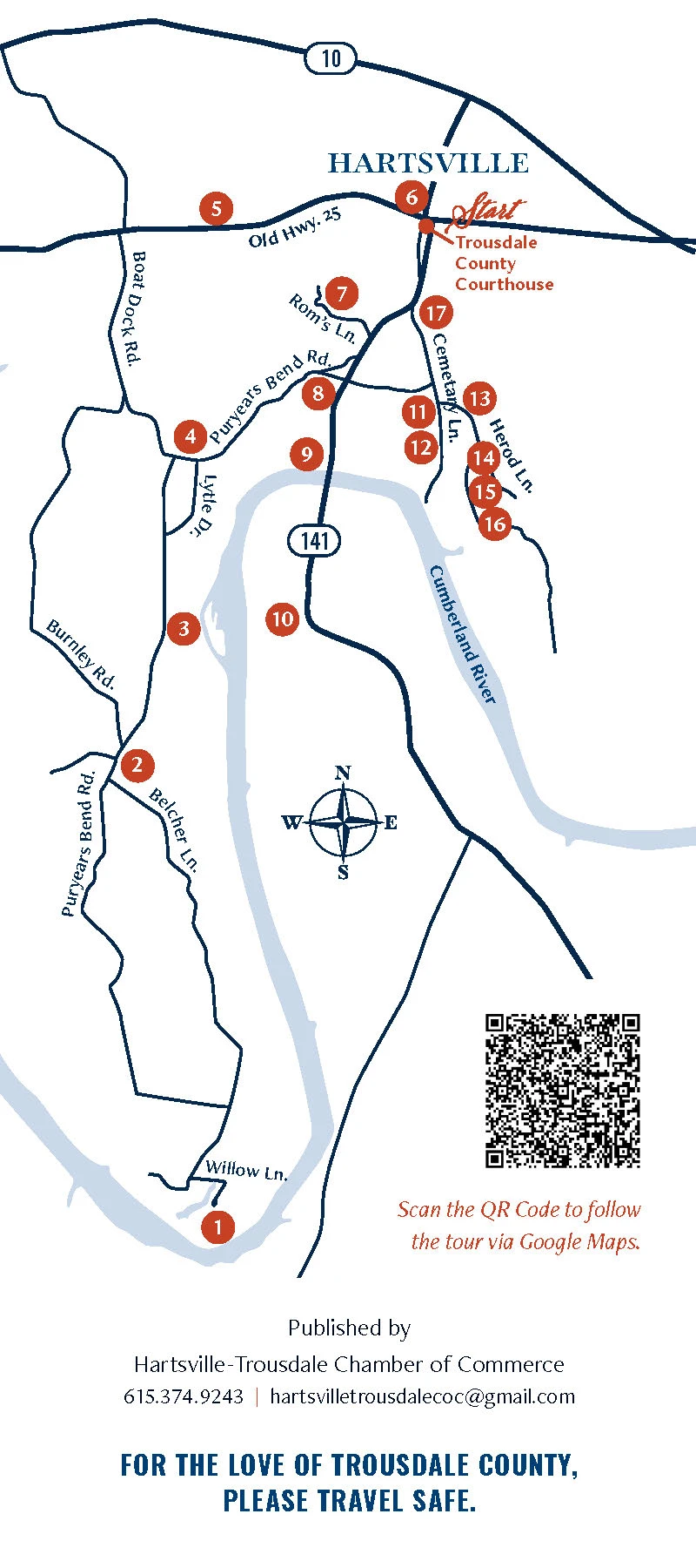 > Get out and stretch your legs. Look around Historic Hartsville. Next drive back out Hwy 141 S (River Street), 0.6 miles, turn right on Rom Lane to Stop 7.